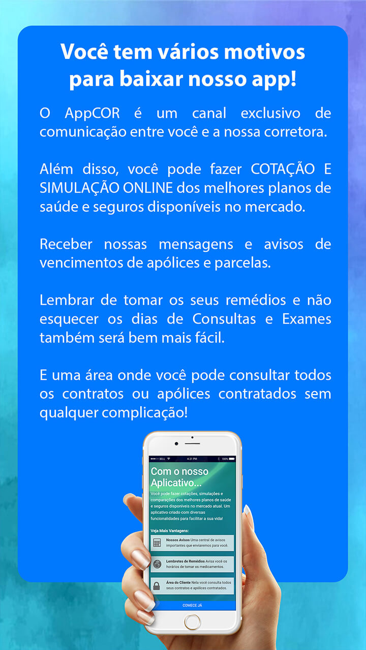 O AppCOR é um canal exclusivo de comunicação entre você e a nossa corretora. Além disso, você pode fazer COTAÇÃO E SIMULAÇÃO ONLINE dos melhores planos de saúde e seguros disponíveis no mercado.
