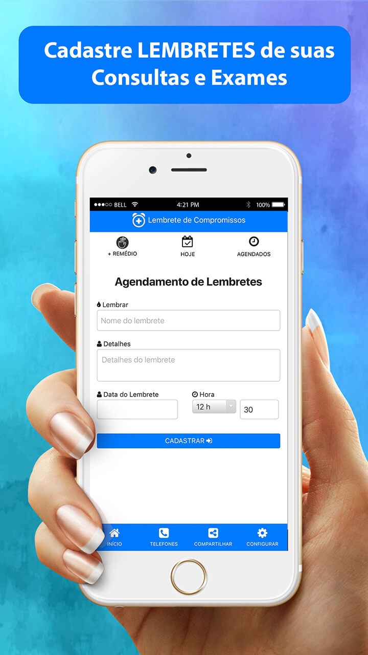 Na área CRIE SEUS LEMBRETES, lembrar de tomar os seus remédios e não esquecer os dias de Consultas e Exames será bem mais fácil. O AppCOR vai te ajudar a LEMBRAR de tomar seus remédios na hora certa.